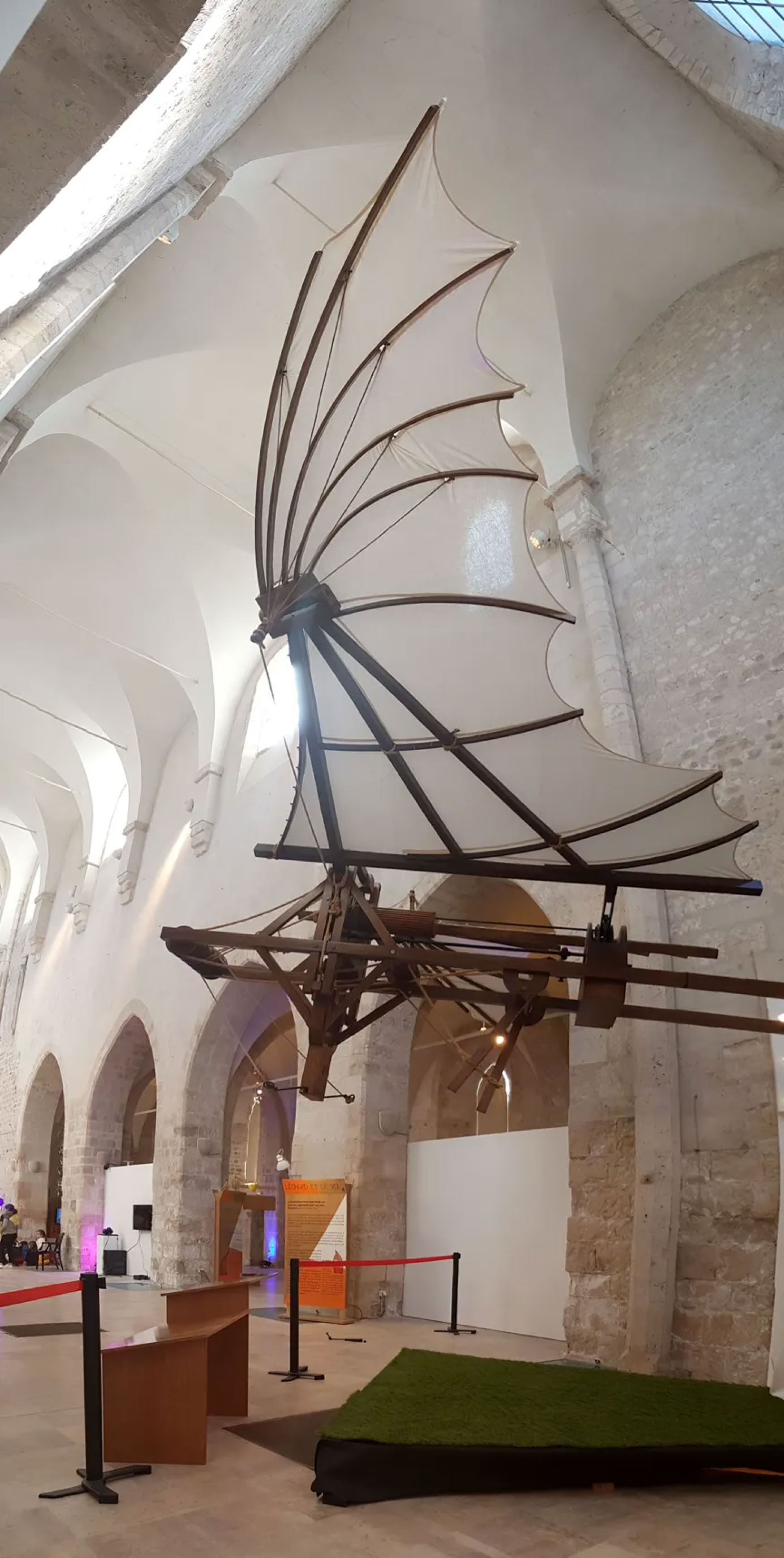 1. L’ORNITOTTERO, la machine volante animée de Léonard de Vinci. Présentée dans un espace Renaissance «Léonard et le vol», cette machine à ailes battantes est suspendue sur câbles ou posée sur un chariot élévateur. 3 50 kg Envergure 9,50 m.